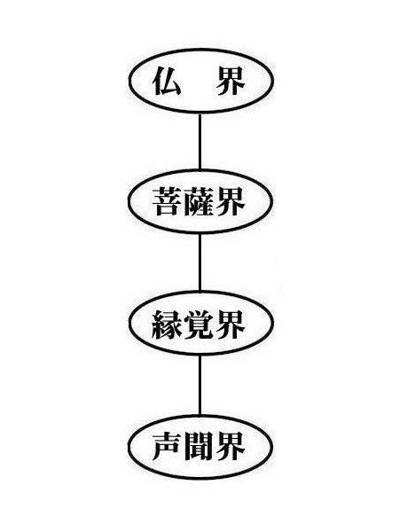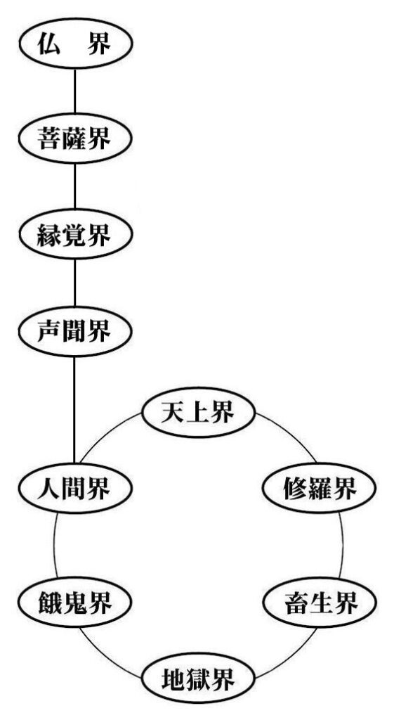 地獄界・餓鬼界・畜生界・修羅界・人間界・天上界・声聞界・縁覚界・菩薩界・仏界の十の心の世界です。これを十界と言います。